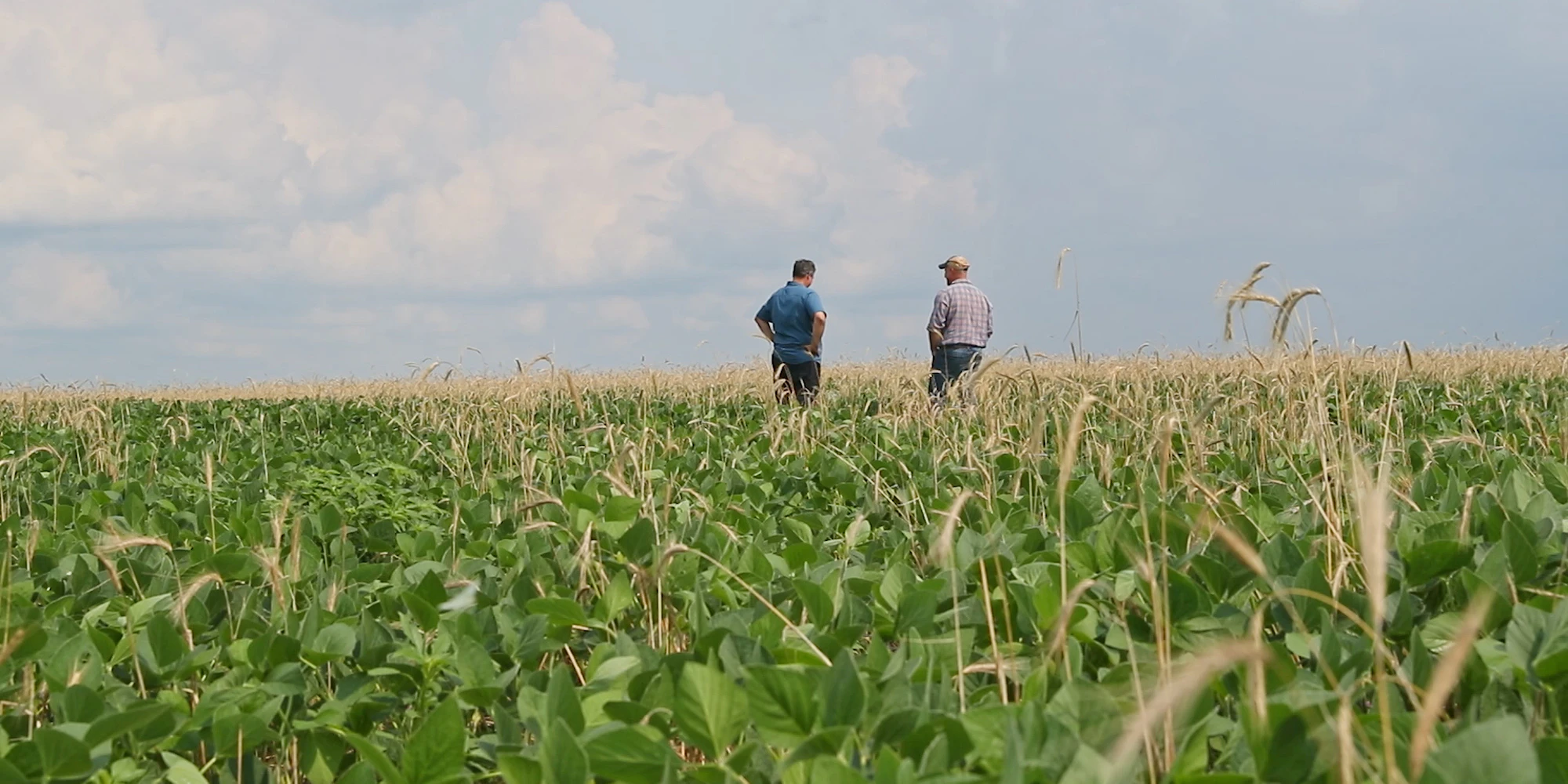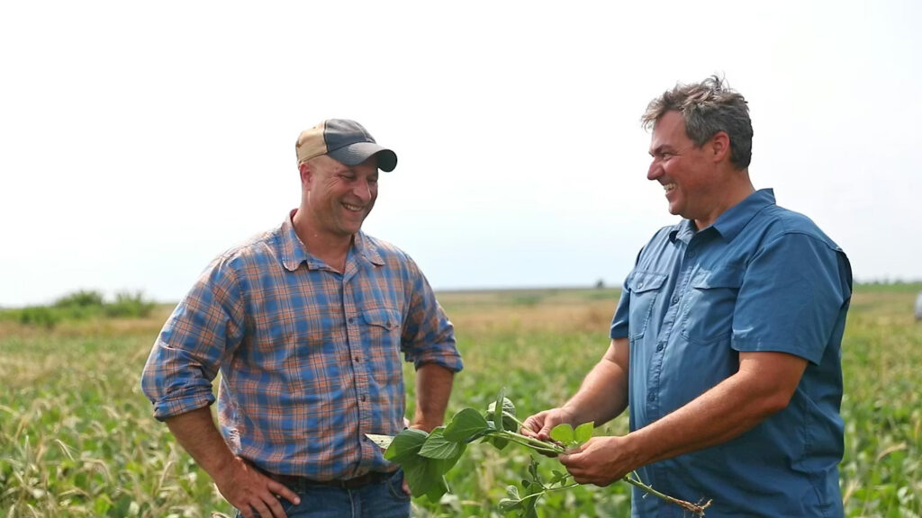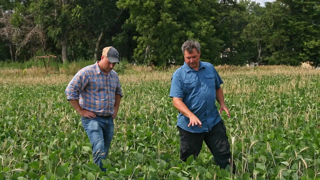 Jesse and Brian walking through a soybean field that was planted in a rye cover crop.